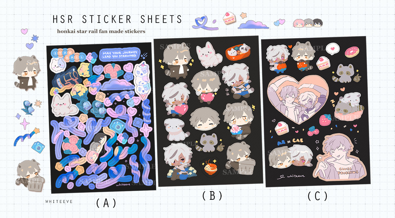 • Please specify in the checkout notes which 3 sticker sheets you want. If you do not write a note, you will get 1 of (A), (B), and (C) as long as they are in stock.