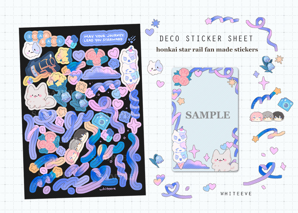 Honkai Star Rail sticker sheets. Ribbons, shooting stars, wubbaboo, the astral express, and flowers from Belobog.